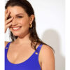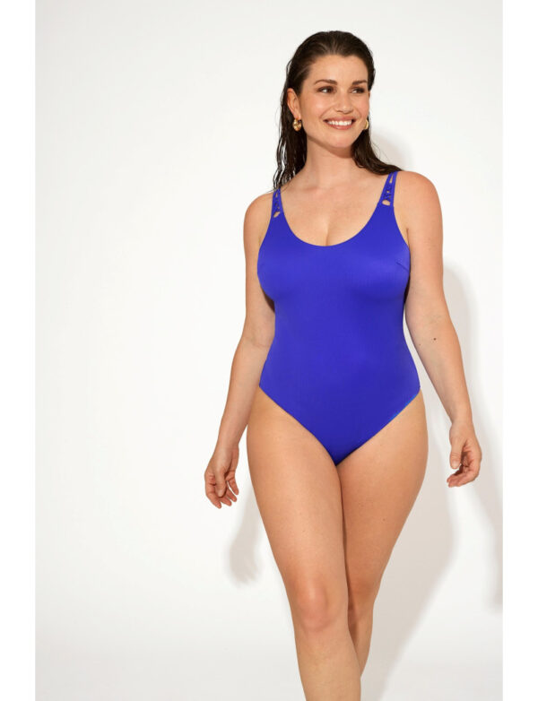Bañador sin aros y con copa foam extraíble realizado. Tejido Jacquard en color azul Klein con detalle trenza en tirantes. Reforzado en el vientre. PATRÓN: CAROLINA