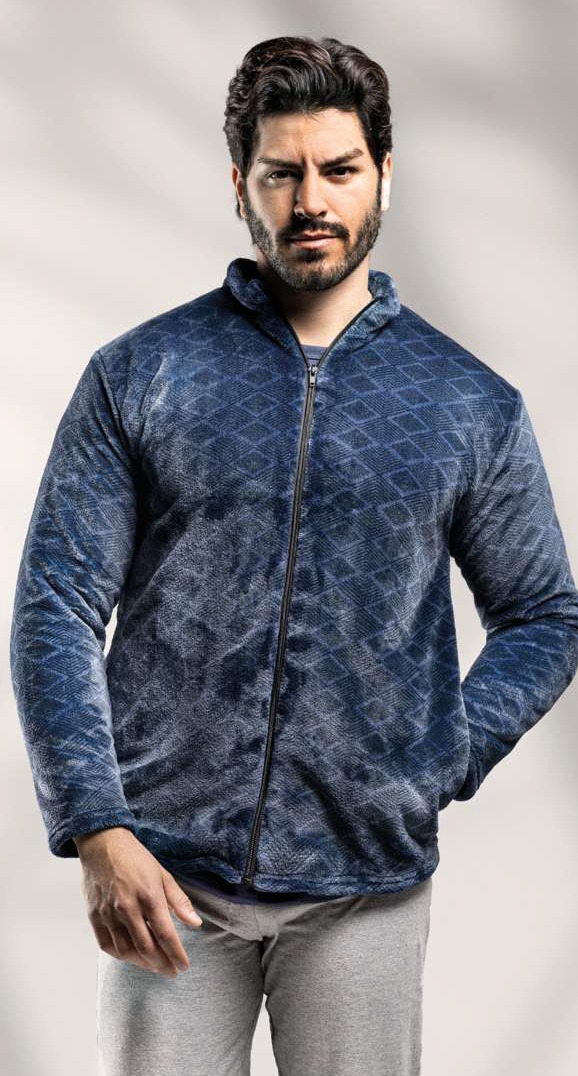 Presenta un diseño clásico con cuello camisero, cierre de botones y mangas largas, ideal para quienes buscan un batín práctico y elegante. El estampado de rombos en azul marino con efecto degradado le da un aire sofisticado, perfecto para estar en casa con confort y distinción.