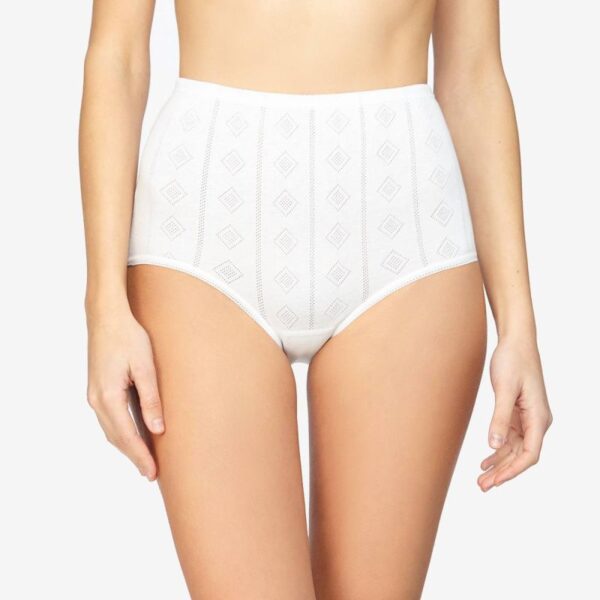 Braguita clásica alta Avet de algodón. Diseño fino con dibujo de jacquard. En la cintura y camales tiene goma cubierta. Además, dispone de refuerzo de rizo en la entrepierna 100% de algodón, muy suave e higiénico. Es una prenda ideal para pieles sensibles. Modelo exclusivo para tallas grandes Diseñada y fabricada en España.
