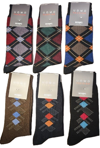 Calcetín Treviso de Scopri, confeccionado en tejido de punto fino con diseño de cuadros tipo tartán o rombos clásicos. Combina tonos contrastados para un estilo elegante y atemporal. Puño elástico que sujeta sin oprimir y costuras planas en la puntera para mayor confort. Composición técnica: mezcla de algodón peinado, poliamida y elastano que asegura transpirabilidad, ajuste perfecto y resistencia al lavado. Apto para uso diario o combinaciones formales.