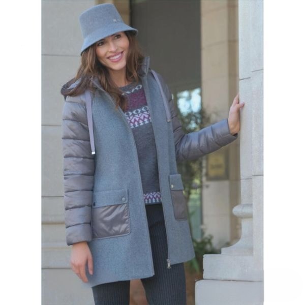Parka de mujer en tono gris medio, con cuerpo de paño y mangas acolchadas. Diseño moderno y funcional, con bolsillos delanteros amplios y capucha ajustable con cordones. Combina calidez y estilo para los días fríos, con acabado elegante propio de la marca MCM.