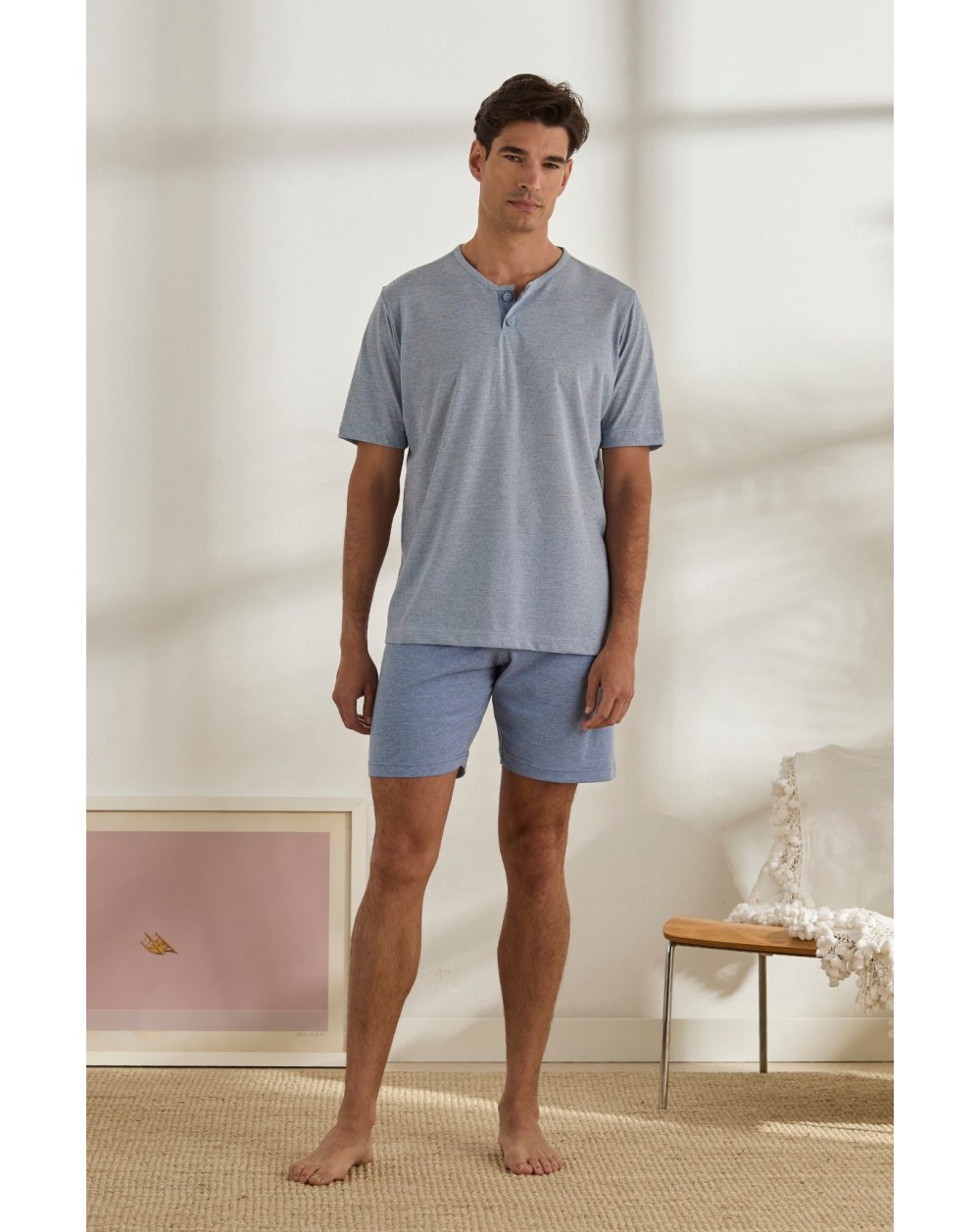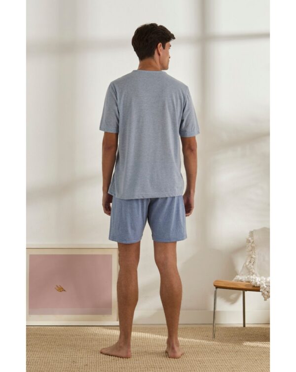 Pijama Hombre En Tejido De Punto 100% Algodón, Compuesto Por Camiseta Con Estampado Grafico Frontal De Manga Corta Con Cuello Redondo Y Tira Del Cuello En Color Contrastado Igual Pantalón. Pantalón Corto Liso Con Cordón Ajustable En La Cintura Y Bolsillos Laterales.