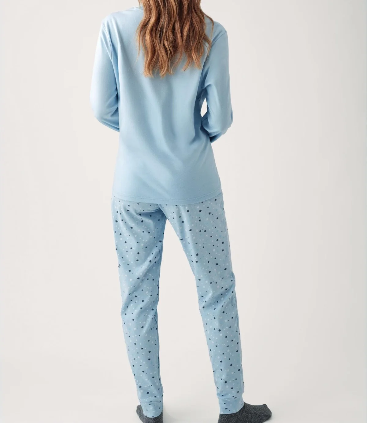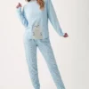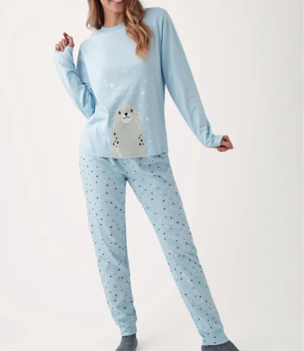 Pijama de mujer confeccionado en algodón con un simpático estampado de focas, ideal para los meses de invierno. El conjunto de dos piezas incluye camiseta de manga larga y pantalón largo con puños en el bajo, que aportan un ajuste cómodo y moderno. El tejido de algodón proporciona suavidad, transpirabilidad y calidez para un descanso confortable. El color azul suave y el diseño divertido lo convierten en una opción acogedora y con estilo para el hogar. Perfecto para relajarte o dormir cómoda y abrigada durante el invierno.