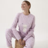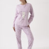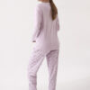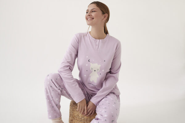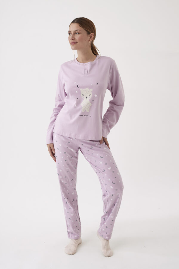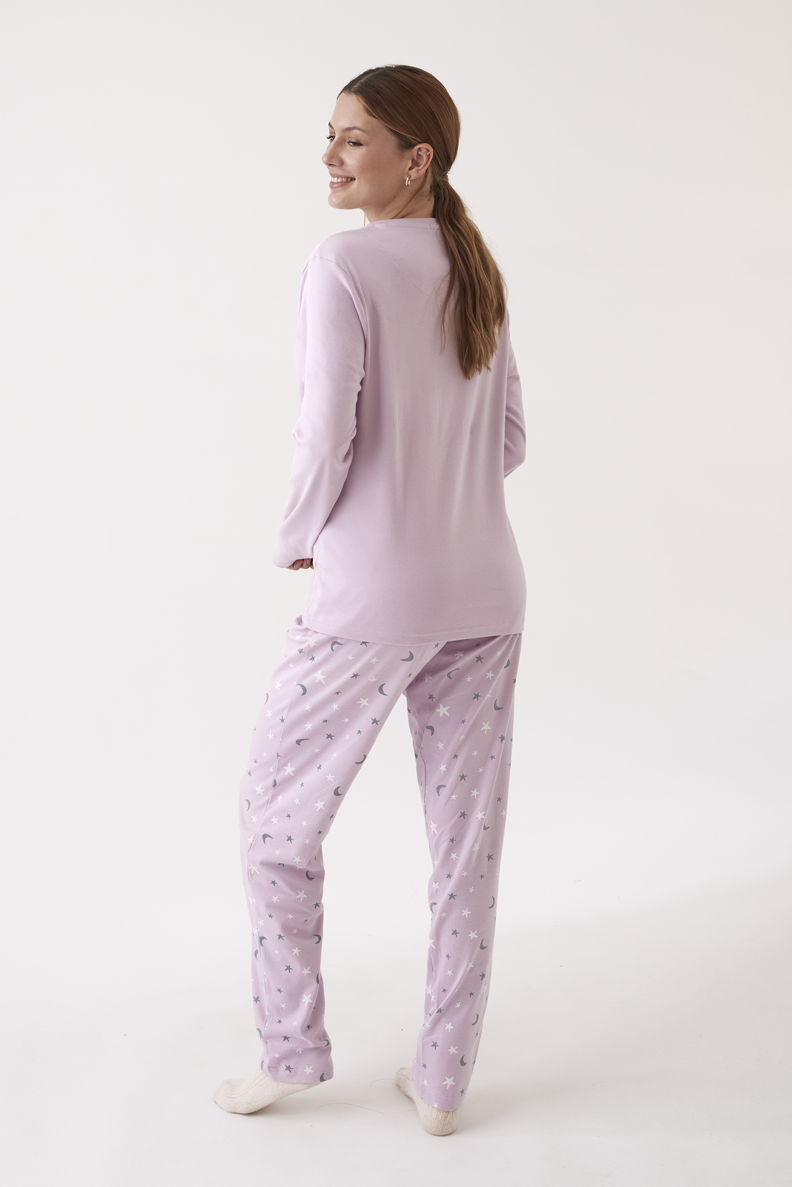 Pantalón estampado estrellas con cinturilla elástica y sin puños en bajos, la camiseta es lisa con dibujo posicionado, cuello redondo con pequeña tapeta de 2 botones.