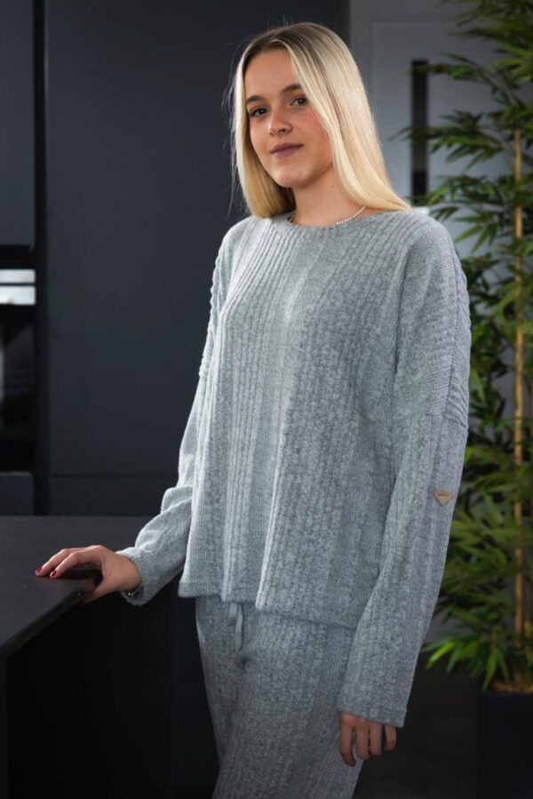 Pijama de mujer Privata modelo PV25430, fabricado en tejido canalé suave y elástico que ofrece comodidad, ligereza y un ajuste agradable sin oprimir. Conjunto de estilo moderno y sensación cálida, ideal para uso diario y noches frescas. Acabados cuidados, logo distintivo de la marca y diseño pensado para un look cómodo pero actual.