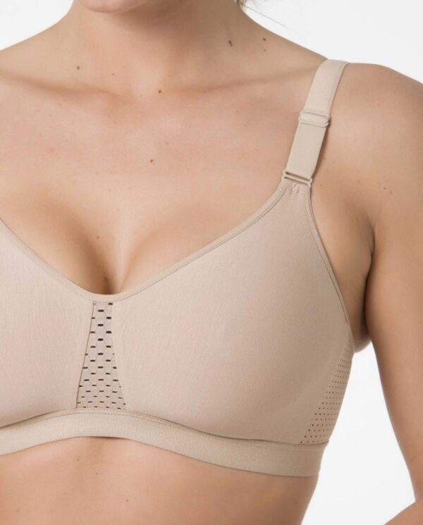 Sujetador hipoalergénico de presión ligera. Adecuado para postoperatorio, que no requiera prótesis, y para procesos de radioterapia que lesionan de forma agresiva la piel de la paciente. Este sujetador está desarrollado con materiales naturales hipoalergénicos para sentir un máximo confort al contacto con la piel. Tejido doble prehormado de algodón, con tirante acolchado de ajuste delantero. Laterales con malla abierta transpirable. De color piel. 76% algodón,14% elastano,10% poliéster
